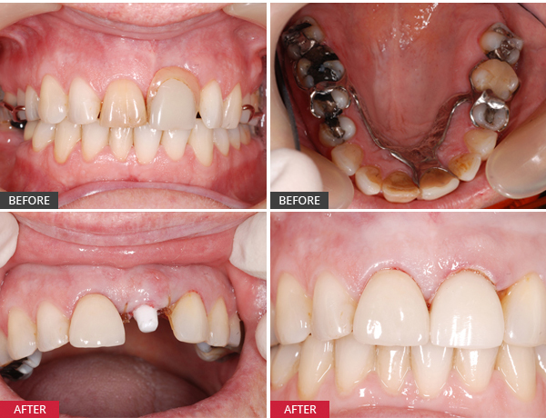 A Zirconia implant was surgically placed and allowed to heal. Later, a crown was placed over the implant. The end result was that the unsightly & loose partial denture was thrown away.