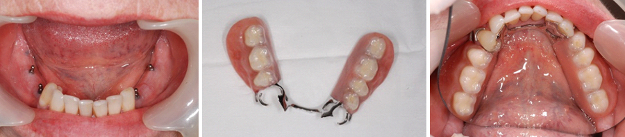 Dental condition: Lower 8 molars abscessed and extremely complex to restore. A decision was made to extract them and retain the lower front teeth. A lower denture was made but it quickly caused sore gums and an inability to eat well as they flopped around.