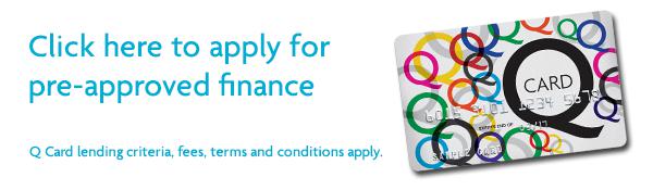 *12 months no payments and no interest (“Payment Holiday”) is available on Q Card Flexi Payment Plans. Minimum spend $350. Account Fees may apply. A $55 Establishment Fee for new Q Cardholders and a $35 Advance Fee for existing Q Cardholders will apply. Q Card Standard Interest Rate applies to any outstanding balance at end of Payment Holiday. Offer is ongoing. Q Card lending criteria, fees, terms and conditions apply.