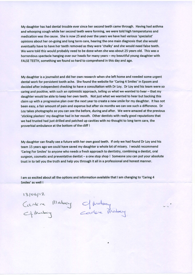 My daughter is a journalist and did her own research when she left home and needed some urgent dental work for persistent tooth ache. She found the website for ‘Caring 4 Smiles’ in Epsom and decided after independent checking to have a consultation with Dr Loy. Dr Loy and his team were so caring and positive, with such an optimistic approach, telling us what we wanted to hear —that my daughter would be able to keep her own teeth. Not just what we wanted to hear but backing this claim up with a progressive plan over the next year to create a new smile for my daughter. It has not been easy, a fair amount of pain and expense but after six months we can see such a difference. Dr Loy takes photographs so you can see the before, during and after. We were amazed at the previous ‘sticking plasters’ my daughter had in her mouth. Other dentists with really good reputations that we had trusted had just drilled and patched up cavities with no thought to long term care, the proverbial ambulance at the bottom of the cliff!