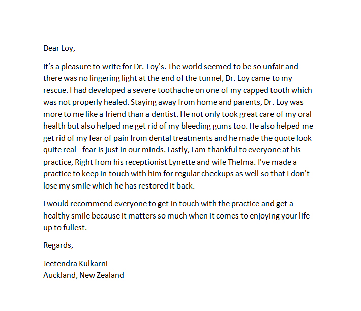 It’s a pleasure to write for Dr. Loy’s. The world seemed to be so unfair and there was no lingering light at the end of the tunnel, Dr. Loy came to my rescue. I had developed a severe toothache on one of my capped tooth which was not properly healed. Staying away from home and parents, Dr. Loy was more to me like a friend than a dentist. He not only took great care of my oral health but also helped me get rid of my bleeding gums too. He also helped me get rid of my fear of pain from dental treatments and he made the quote look quite real – fear is just in our minds. Lastly, I am thankful to everyone at his practice, Right from his receptionist Lynette and wife Thelma. I’ve made a practice to keep in touch with him for regular checkups as well so that I don’t lose my smile which he has restored it back.