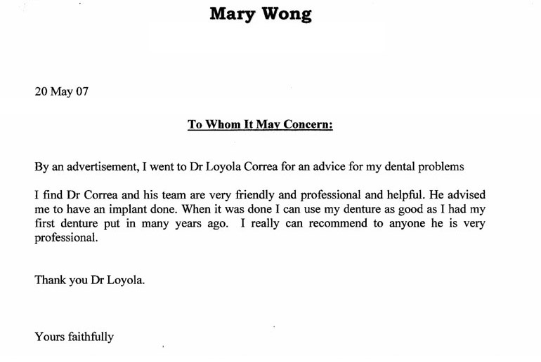 I find Dr Correa and his team are very friendly and professional and helpful. He advised me to have an implant done. When it was done I can use my denture as good as I had my first denture put in many years ago. I really can recommend to anyone he is very professional.