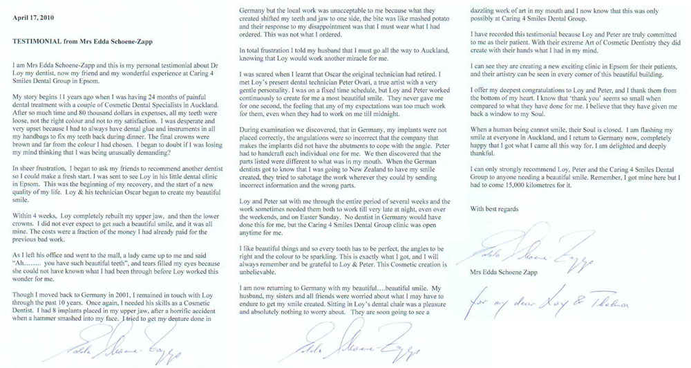 I am Mrs Edda Schoene-Zapp and this is my personal testimonial about Dr Loy my dentist, now my friend and my wonderful experience at Caring 4 Smiles Dental Group in Epsom.